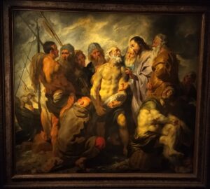 In one single action: follow the actors in their gestures; the open, inviting hands of Jesus in his beautiful robe; Peter’s hands, which for the time being, still hold on to his beautiful catch.